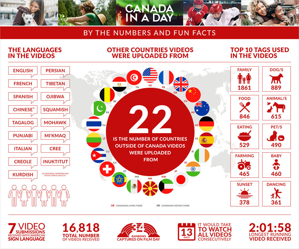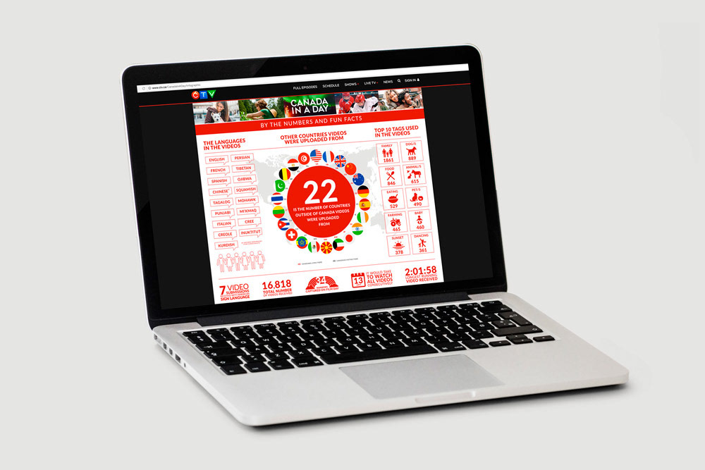 An infographic I designed that was posted on CTV website to show fun facts about the submitted videos for Canada In A Day film.