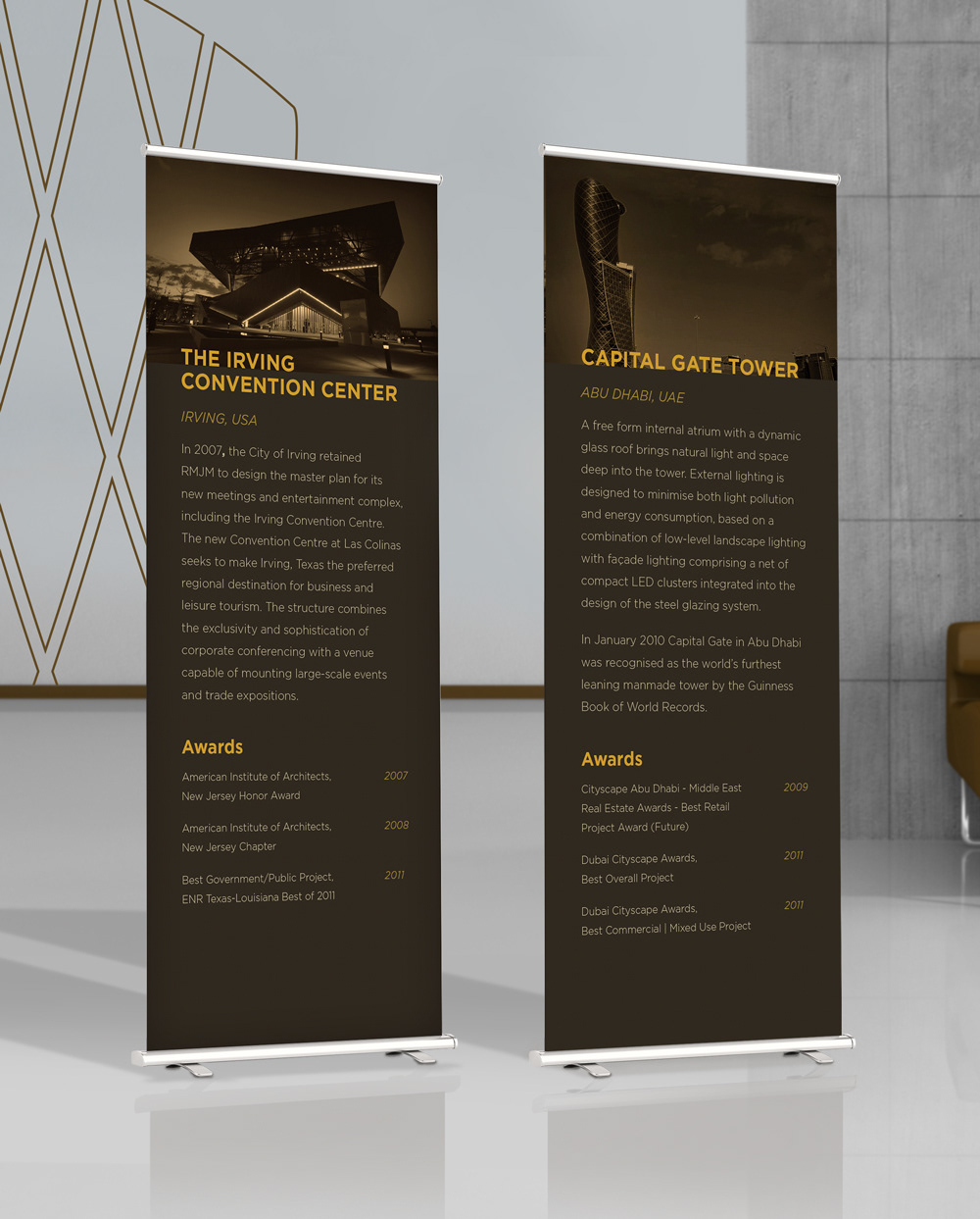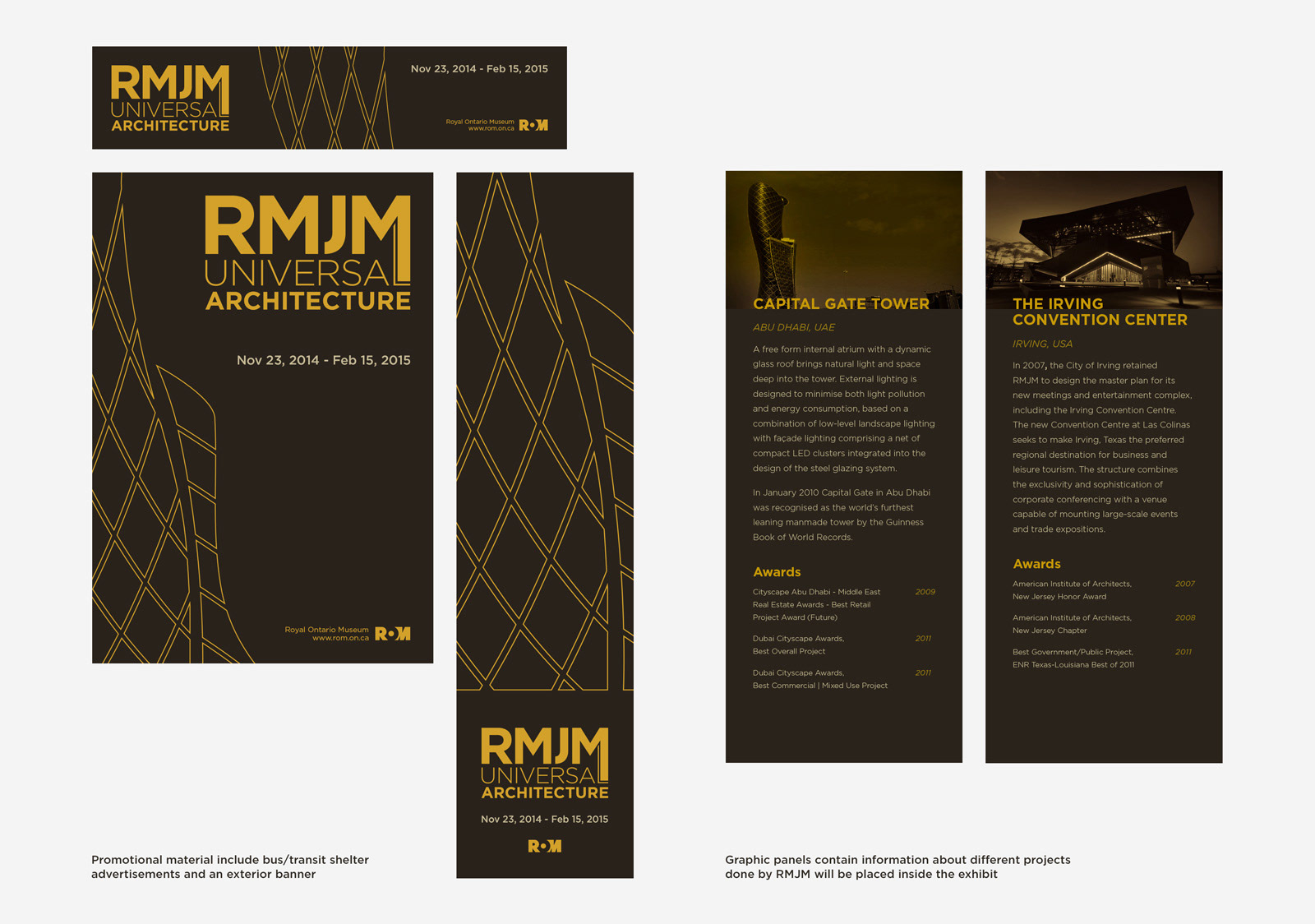 This project was for the experiential design course. The task was to work on a campaign to promote an architectural exhibit. I chose an international firm called RMJM and used one of their iconic buildings, The Capital Gate, as a visual keyart to design all the promotional and marketing materials. The colour scheme is inspired by the location of the building (Abu Dhabi, UAE) and its people's lifestyle/culture. The dark background colour represents oil, the yellow represents gold, and the light brown represents the soil and deserts. The wordmark incorporates a subtle yet meaningful typographic detail: the ‘L’ in universal is seamlessly connected to the ‘M’ above it. This intentional merging of forms represents the concept of universality, different elements coming together as one cohesive whole. It symbolizes unity and interconnectedness, visually reinforcing the event’s theme.
